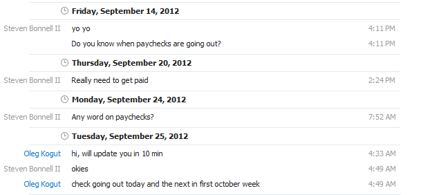 By the time August rolled around, I had to pester Oleg fairly often on Skype about when paychecks were going out. When we got to September, paychecks were being paid months late. Oleg became increasingly less responsive on Skype. At this point I was stuck in Poland after having exhausted a large majority of my savings. I could barely afford food and necessities for my child and his mother while staying there.
